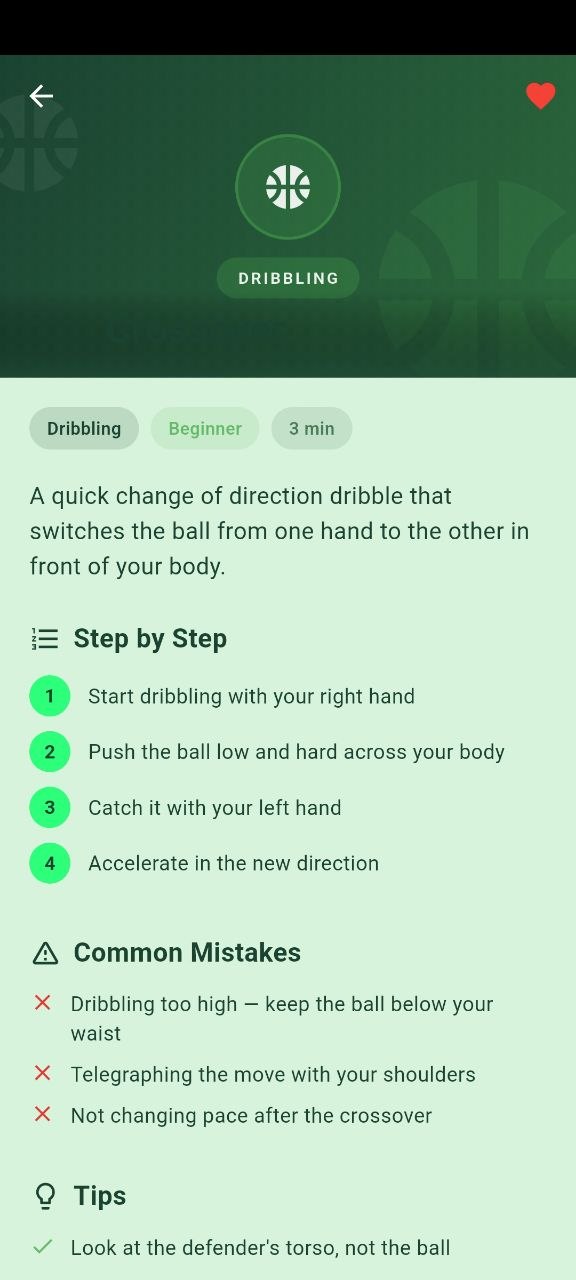 Users can move from simple fundamentals into more specific ball control and shooting work. This makes the app feel more complete than a basic glossary.